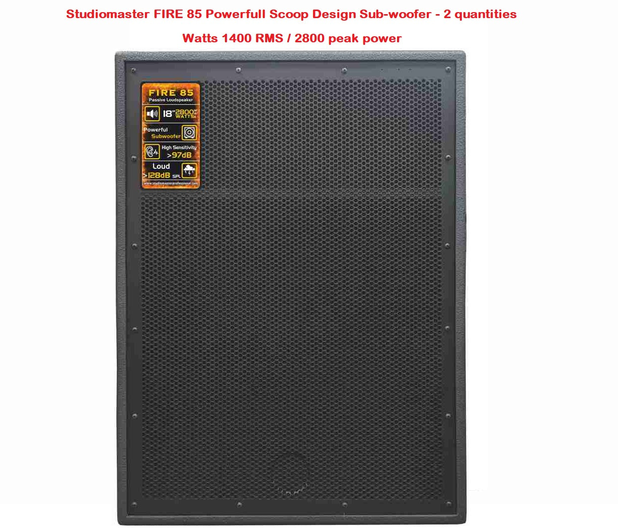 - Studiomaster FIRE-85 Scoop design Sub-woofer speaker (1400watts RMS *2 nos = 2800 watts)- 2 Quantity of Sub-Woofer speakers.