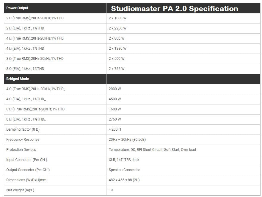 - Studiomaster PA 2.0 amplifier - 1 Quantity(for Top speaker of Studiomaster FIRE 45 speakers)