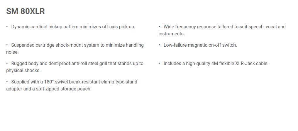 - The SM 80 XLR is a high quality microphone with a frequency response designed for speech, vocal and instrument miking.