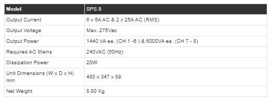 - 6 x 6 Ampere Output Channels for other lower power equipment like Mixers, CD Players, processors etc.